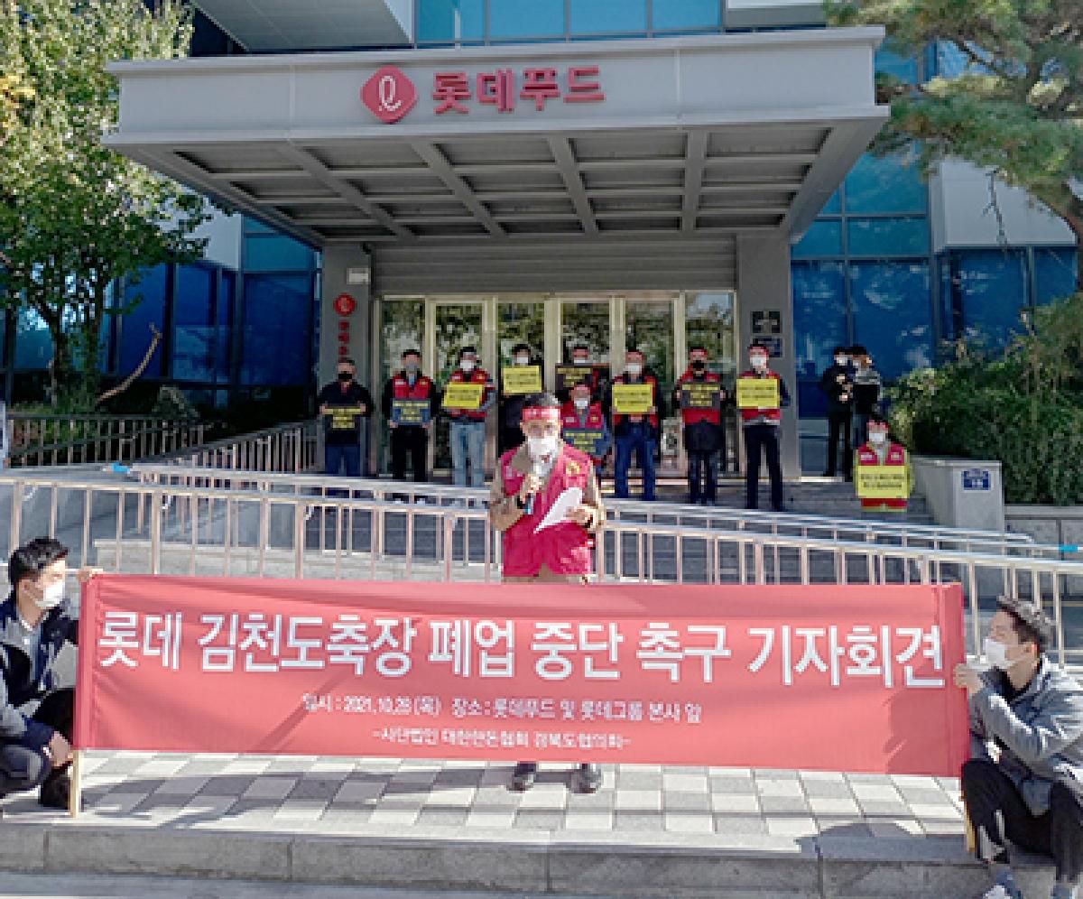 경북지역 양돈농가들은 지난 1028일 대한한돈협회 주최로 서울 롯데그룹과 롯데푸드() 본사 앞에서 한돈산업 사수?생존권 쟁취를 위한 기자회견을 잇따라 열고 김천도축장 폐쇄 철회를 요구했다. 이들 농가들은 경제성만을 내세워 사회적 책임을 도외시 하는 대기업 횡포로 인해 수십년간 상생해온 양돈농가들이 하루아침에 출하처를 잃고, 지역경제 기반마저 무너지게 됐다며 롯데푸드의 이번 방침이 양돈농가들에 대한 사망통보라고 비난했다.