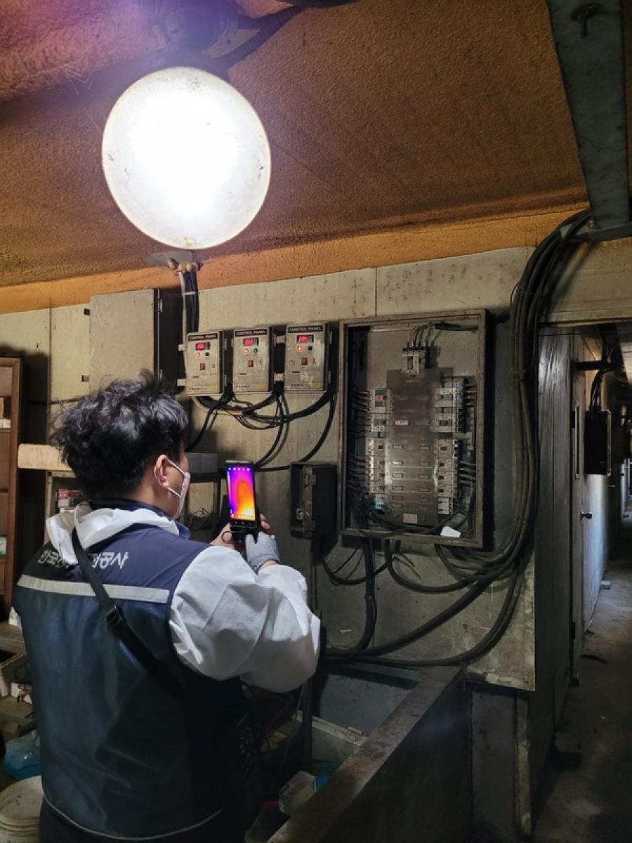 한국전기안전공사 직원이 충북 진천의 한 양돈농가에서 전기안전점검을 실시하는 모습.