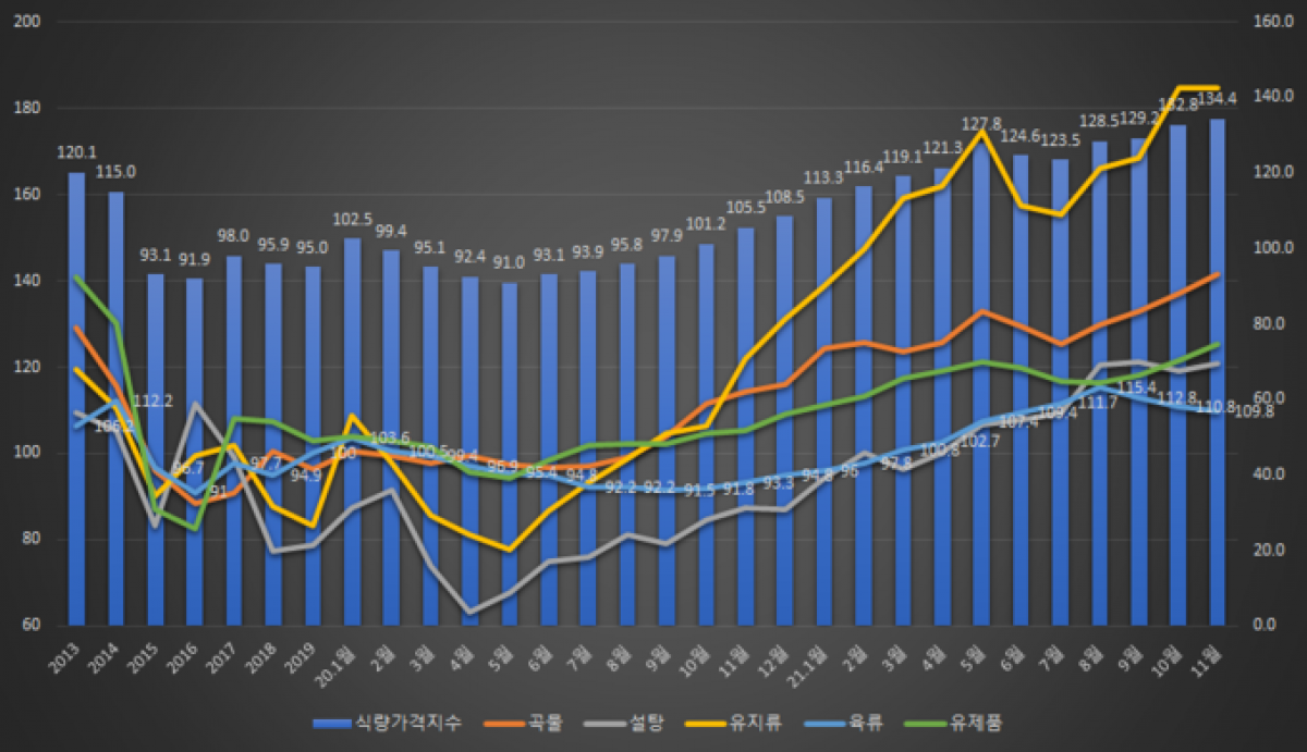 그외 설탕은 10(119.1포인트)보다 1.4% 상승한 120.7포인트, 유지류는 10(184.8포인트)보다 0.1% 하락한 184.6포인트를 각각 기록했습니다. 전년 동월 대비는 각각 38.0%, 51.4% 상승한 수준입니다.