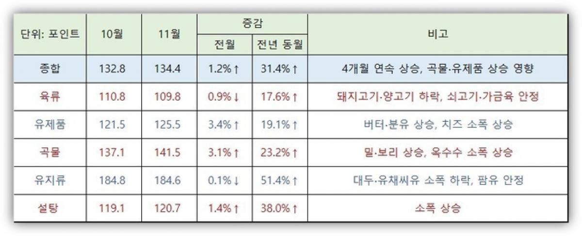 국제연합식량농업기구(FAO)에 따르면 11월 세계식량가격지수는 전월(132.8포인트)보다 1.2% 상승한 134.4포인를 기록했습니다. 4개월 연속 상승이며, '116월 이후 최고 수준입니다. 곡물과 유제품의 가격이 상승한 결과입니다.