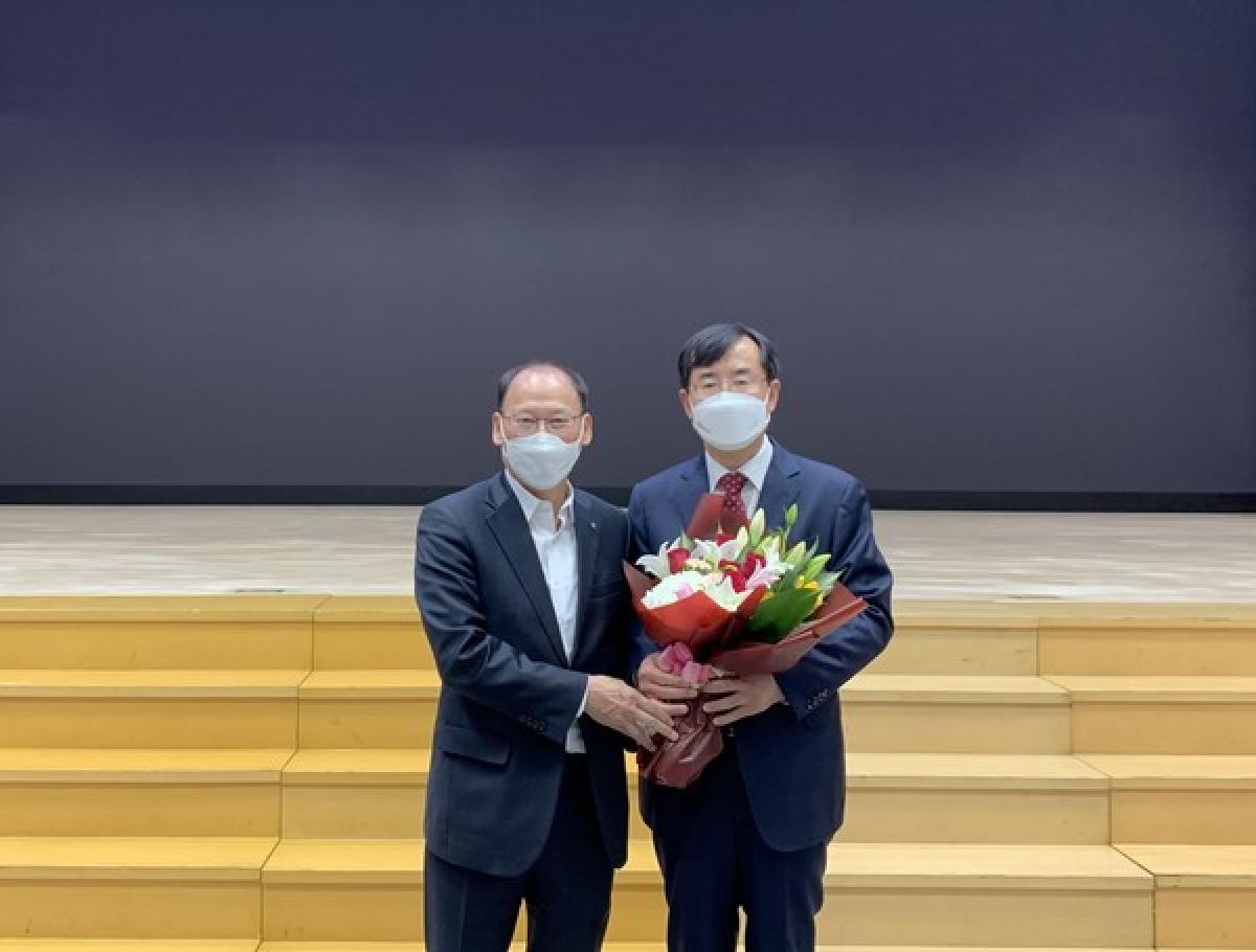 김태환 농협경제지주 축산경제대표이사(왼쪽)가 안병우 축산경제대표이사 선출대상자에게 꽃다발을 건네고 기념사진을 촬영하는 모습.