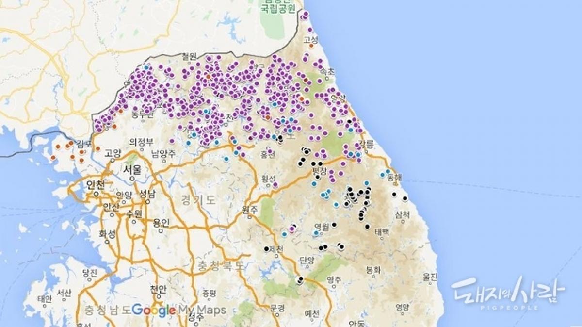 8일 기준 국내 ASF 농장 발생(주황) 및 양성멧돼지 발견지점(보라, 파랑 및 검정)@구글지도 편집