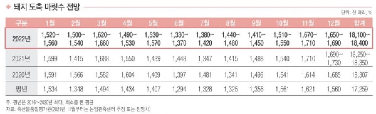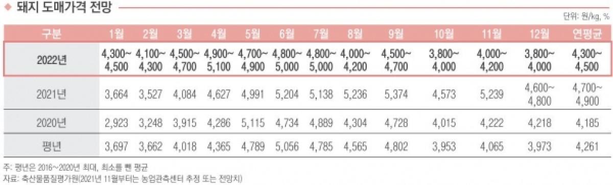 그러나 내년은 다르다. 농경연은 도축두수와 수입량이 증가하면서 올해보다 다소 낮은 4300~4500원에 그칠 것으로 추산했다. 올 하반기 모돈 두수가 늘고 평년 대비 높은 생산성이 유지되면서 내년 도축두수는 1810~1840만마리로 올해와 비슷하고 평년에 비해서는 5% 안팎 많을 것이란 전망이다. 또한 올 하반기 시작된 돼지고기 수입량 증가추세는 내년에도 이어져 내년 수입물량이 34~36만톤에 이를 것으로 예상했다. 여기다 국내외 일상 회복으로 인한 수급 상황이 변동될 수 있어 가격이 더 하락할 가능성도 배제할 수 없다고 덧붙였다.