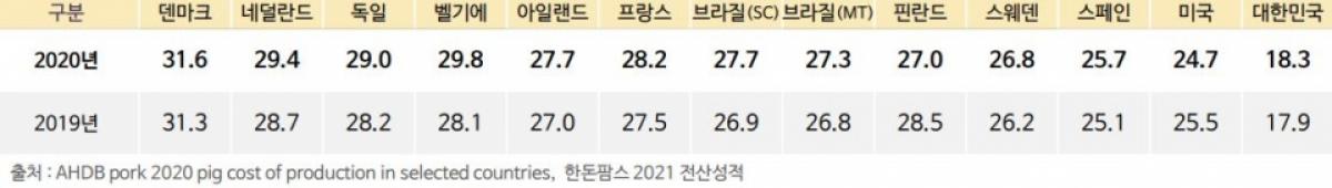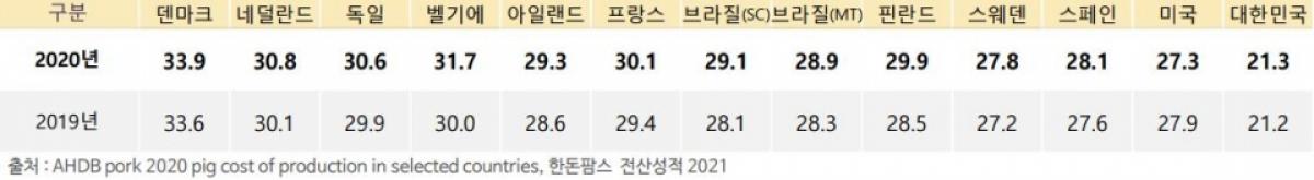 또한 지난해 돈육 수출국들의 PSYMSY덴마크=PSY 33.9, MSY 31.6네덜란드=PSY 30.8, MSY 29.4독일=PSY 30.6, MSY 29.0벨기에=PSY 31.MSY 28.1프랑스=PSY 30.1, MSY 28.2브라질=PSY 29.1, MSY 27.7스페인=PSY 27.8, MSY 25.7미국=PSY 27.3, MSY 24.7두로 나타났다.
