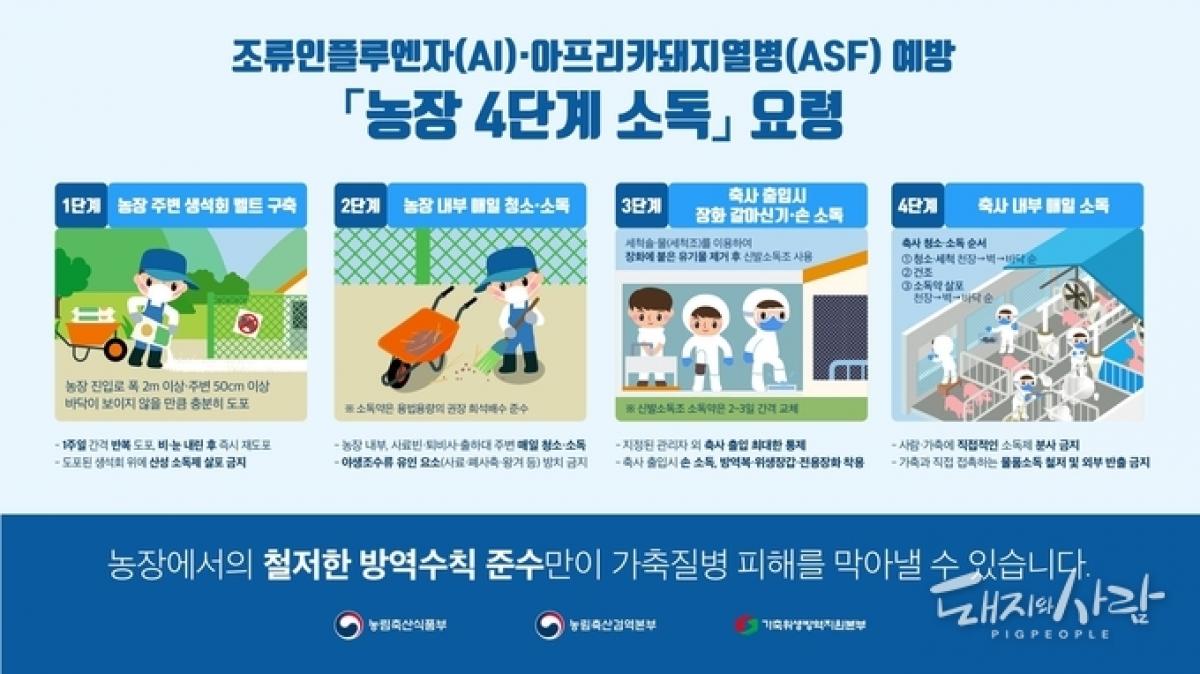 해당 소독 세부 기준은 그간 농식품부가 홍보해 온 '농장 4단계 소독 요령' 그대로입니다. 농장 주변 생석회 도포 농장 내부 매일 청소소독 축사 출입시 장화 교체손소독 축사 내부 매일 소독 등.