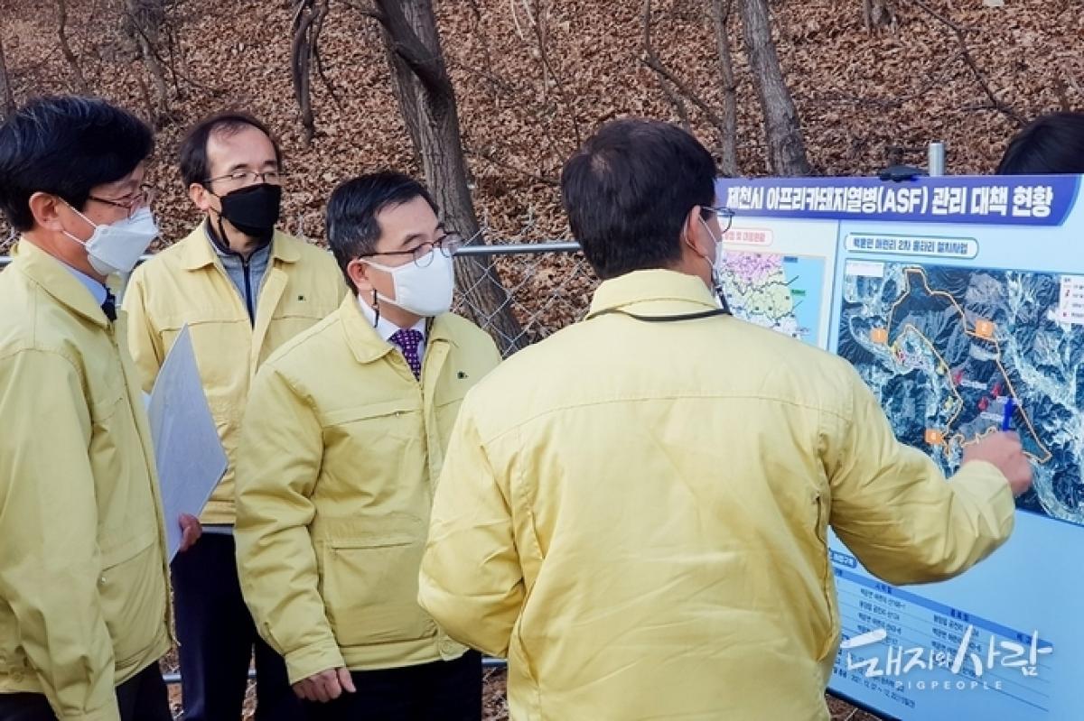 13일 충북 제천시 백운면 일대 차단 울타리 설치 현장을 찾은 홍전기 환경부 차관@환경부