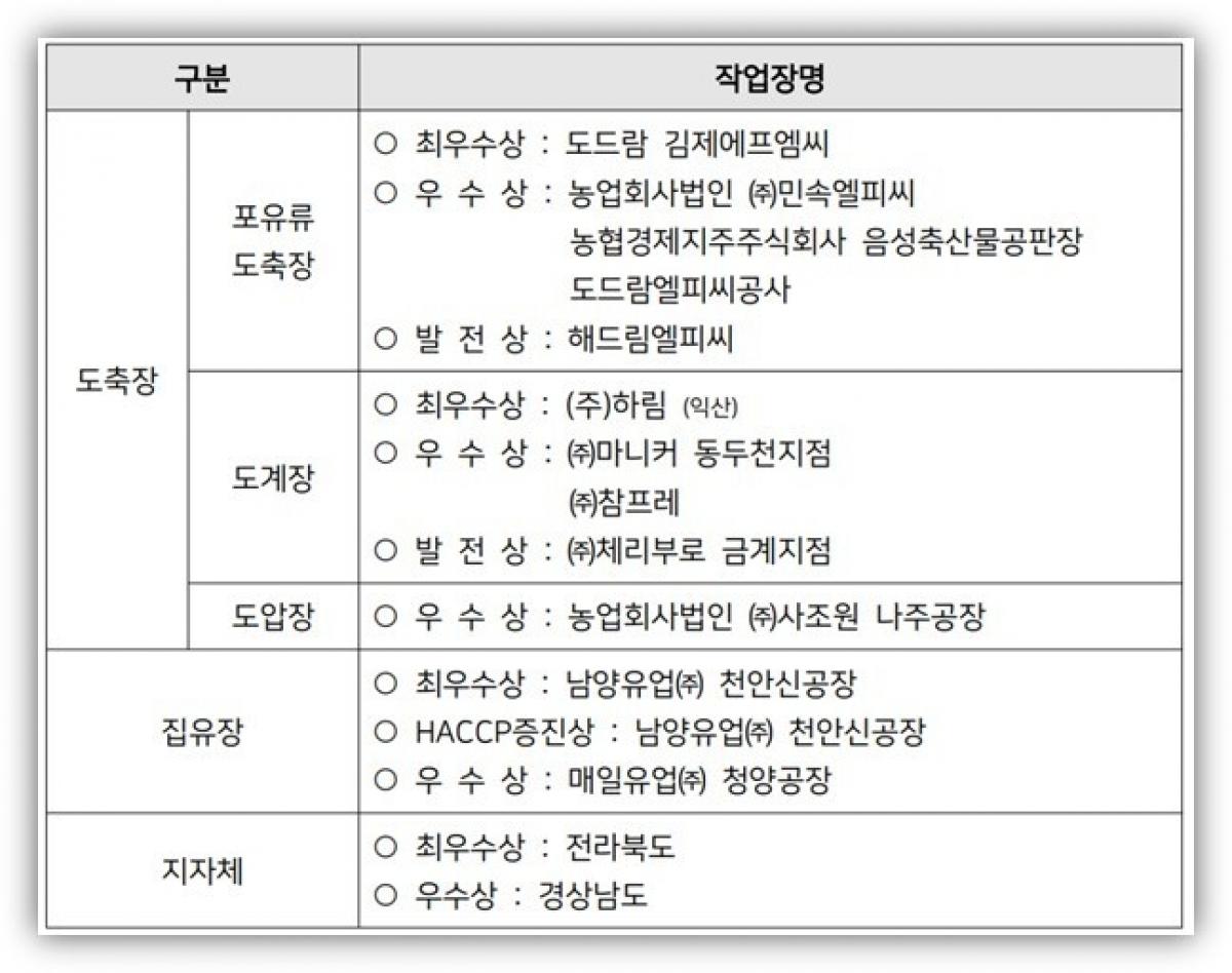 도드람김제FMC, 올해 소비자가 뽑은 베스트 도축장 '최우수상' 수상 한국소비자연맹 ‘2021년 소비자가 뽑은 베스트 도축장·집유장’ 선정 결과...도드람엘피씨공사는 우수상 도드람(조합장 박광욱)이 운영하고 있는 도드람김제FMC와 도드람엘피씨공사가 ‘2021 소비자가 뽑은 베스트 도축장’ 최우수상과 우수상에 나란히 선정됐습니다. ▲ 2021년 소비자가 뽑은 베스트 도축장, 집유장 선정 결과@한국소비자연맹 농림축산식품부가 주최하고 한국소비자연맹 주관으로 실시되는 ‘소비자가 뽑은 베스트 도축장·집유장’은 HACCP 운용수준 평가 상위업체를 대상으로 선정합니다. 도축장은 포유류, 도계장, 도압장을 나눠 HACCP 운용 적정성, 위생적인 작업관리, 종사자의 HACCP 인식수준의 향상, 경영자의 의지 등을 평가합니다. 평가 결과 도드람김제FMC는 포유류 부문 최우수상에, 도드람엘피씨공사는 포유류 부문 우수상에 각각 선정되어 도드람 도축장 두 곳이 모두 수상하는 영광을 얻었습니다. 특히, 2019년 신진상을 수상한 도드람김제FMC는 2년 만에 최고상을 수상하는 영예를 안았습니다. 도드람엘피씨공사도 2017년, 2020년에 이어 3번째로 우수상을 수상하며 선진 도축장으로 입지를 공고히 하고 있습니다. 지난 2018년 준공한 도드람김제FMC는 덴마크, 독일 등 축산 선진국의 최첨단 도축 기술을 도입하는 등 과감한 설비 투자로 도축과 위생 부분 경쟁력을 높였습니다. 스팀탕박기, 개체별 무선인식(RFID) 시스템, 최첨단 로봇을 활용한 개복작업과 도체 이분체 작업은 위생수준과 작업의 효율성을 모두 향상시켰습니다. 도드람엘피씨공사는 수도권과 경기지역 최초의 HACCP 인증 거점도축장으로 철저한 위생 및 안전 관리를 통해 믿을 수 있는 축산물을 공급하며 수도권 축산물 유통의 중심거점 역할뿐만 아니라 축산물 가격 안정, 축산 농가 보호에도 기여하고 있습니다. 도드람은 도축장 두 곳 모두 도축, 가공, 부산물 처리까지 외부 노출이 없는 논스톱(non-stop) 구조로 설계했으며, 도드람만의 콜드체인시스템을 바탕으로 각 공정단계별 온도를 최적으로 컨트롤할 수 있는 온도관리 시스템을 구축했습니다. 또한, 도드람품질관리위원회를 구성하여 도드람한돈의 품질, 안전성 향상을 위해 힘쓰고 있습니다. 박광욱 도드람양돈농협 조합장은 “도드람김제FMC와 도드람엘피씨공사가 포유류부문 최우수, 우수 도축장으로 선정되어 매우 영광스럽게 생각하고, 도드람한돈을 사랑해주시는 소비자분들께 감사드린다”라며 “코로나19로 건강과 식품안전성에 대한 소비자 관심이 날로 높아지고 있는 만큼, 더욱 안전한 먹거리를 공급하기 위해 최선의 노력을 다하겠다”라고 전했습니다. ![]() ▲ 도드람김제FMC 전경@도드람 ![]() ▲ 도드람엘피씨공사 전경@도드람 [출처: 돼지와사람 2021. 12. 16.] |