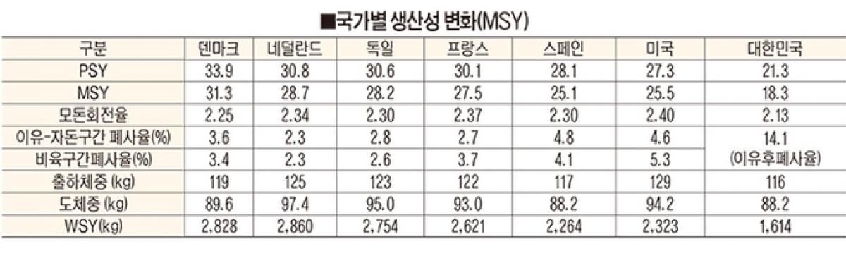 2020년 해외 각국의 생산성을 보면 미국을 제외한 덴마크와 네덜란드, 독일, 벨기에, 프랑스, 스페인 등 EU 회원국가들 대부분이 전년과 비교해 PSYMSY 모두 늘어난 것으로 조사됐다. 국내 양돈산업의 경쟁력이 제자리 걸음만 반복하고 있다는 분석이 무리가 아님을 뒷받침하는 대목이다.