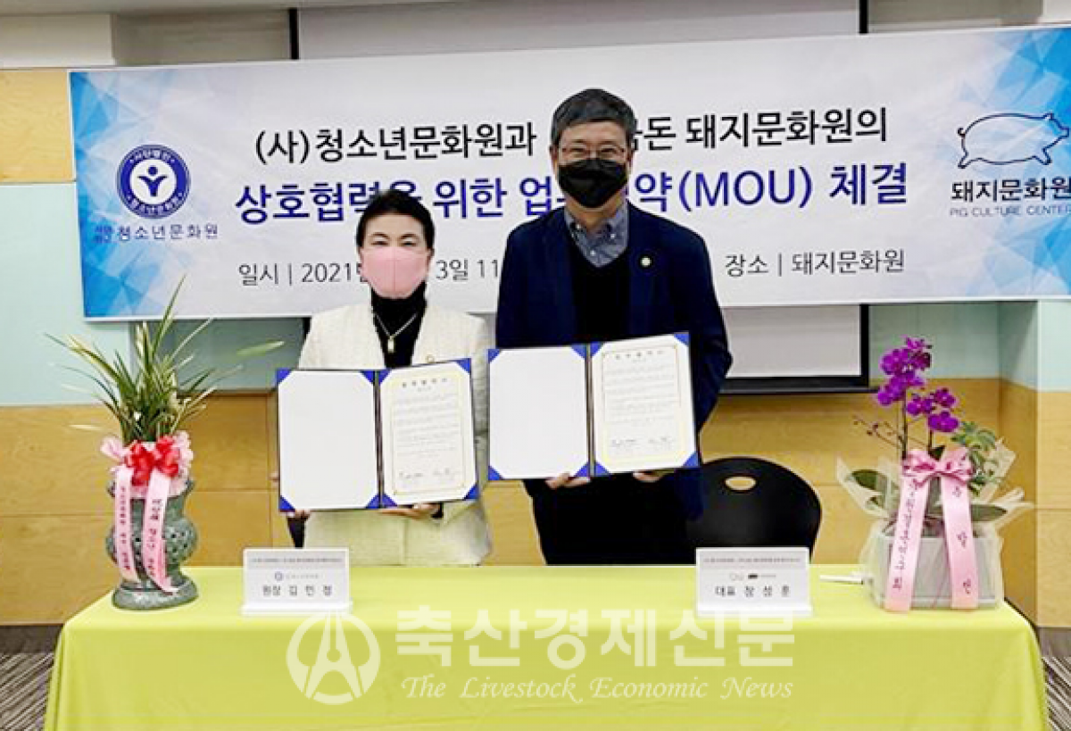 장성훈 금돈 돼지문화원 대표(오른쪽)과 김민정 청소년문화원장이 협약식 후 기념촬영을 하고 있다.
