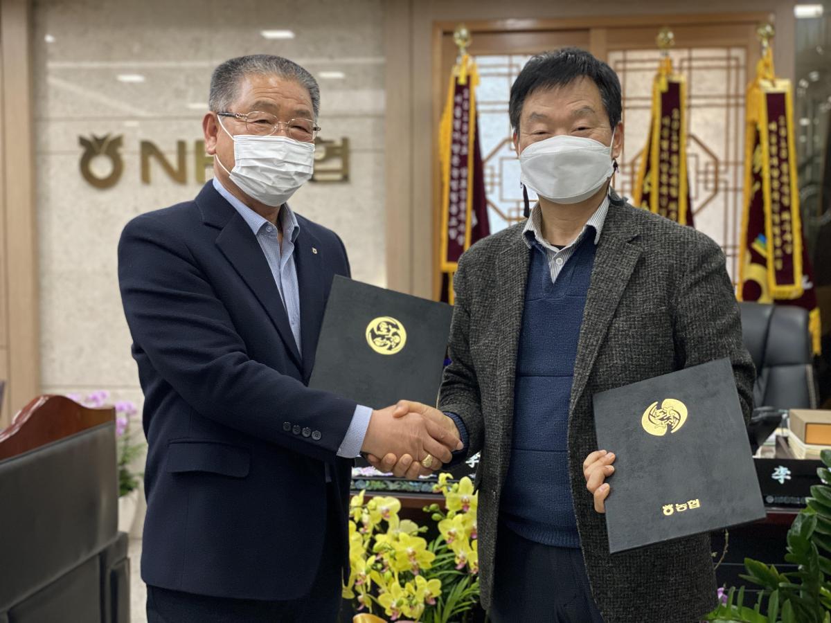 <사진설명> 서울경기양돈농협 이정배 조합장과 양주농축수산물도매시장 류정하 대표이사가 지난 3월 22일 서울 강동구 서울경기양돈농협 본점에서 MOU를 진행한 후 양해각서를 교환하고 있다.