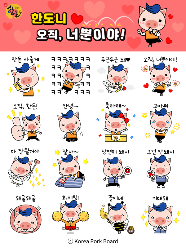 30일 오후 2시부터 선착순 2만 5천명을 대상으로 무료 배포하는 이모티콘은 국민들이 우리돼지 한돈을 일상생활에서 친근하게 경험할 수 있는 기회를 마련하기 위한 것으로, 한도니의 사랑스러움을 강조한 총 16종의 메시지를 담았다. '당연히 돼지', '두근두근 돼'. '돼굴돼굴' 등 다양한 일상문구 및 감정표현에 한돈만의 감성을 더해 재치있게 표현했다.