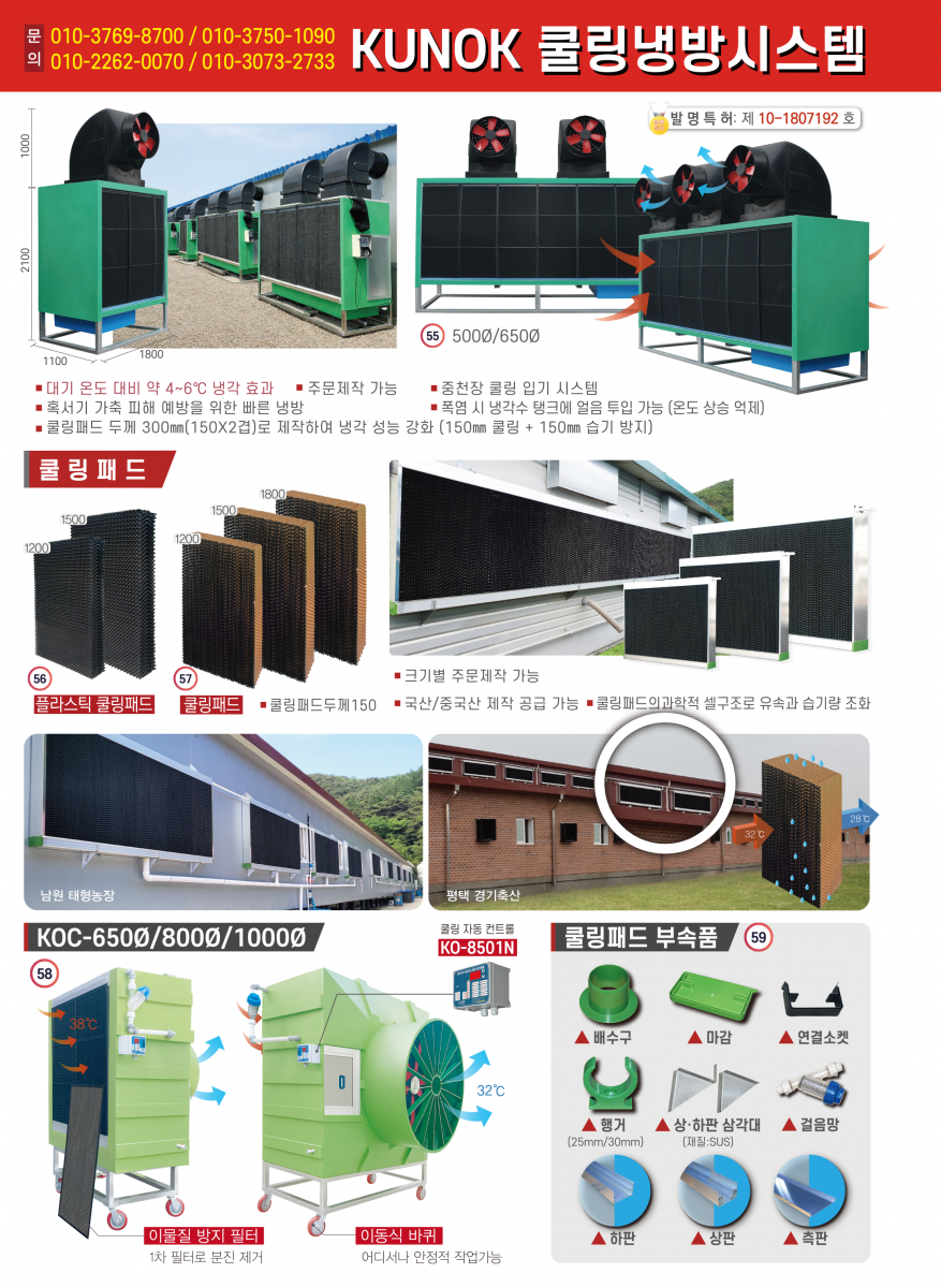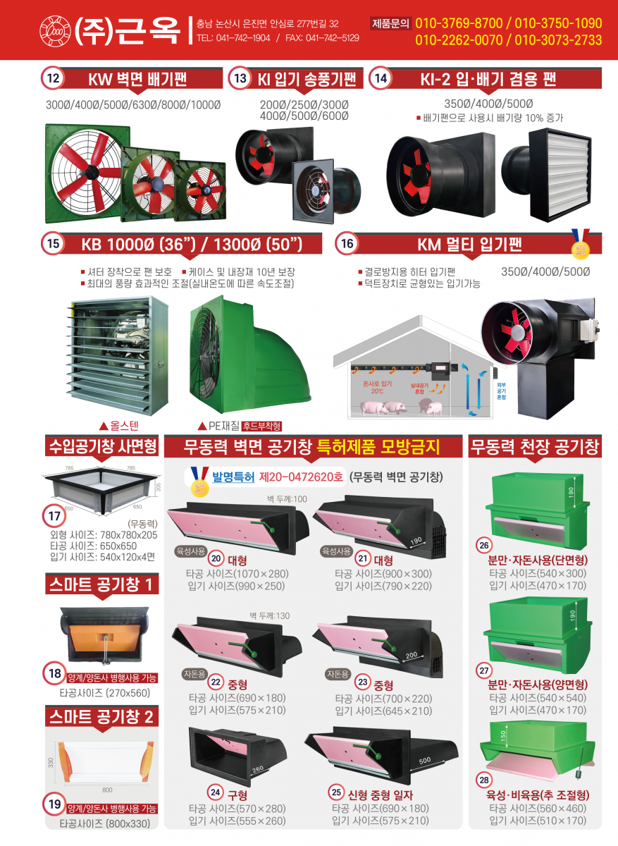 • 굴뚝휀, 배기휀, 후드, 공기창, 쿨링패드, 인큐베이터, , 쿨링냉방시스템, 바닥재, ICT 컨트롤러 등