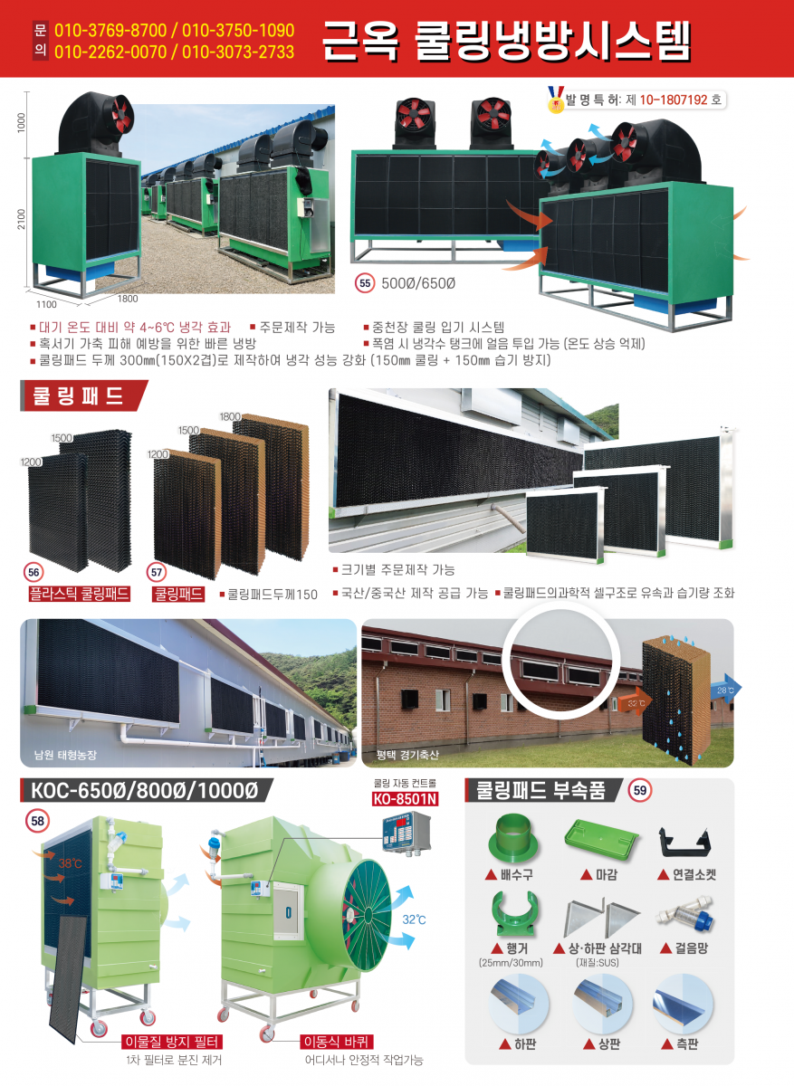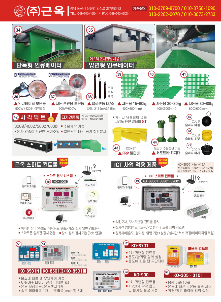 • 굴뚝휀, 배기휀, 후드, 공기창, 쿨링패드, 인큐베이터, , 쿨링냉방시스템, 바닥재, ICT 컨트롤러 등